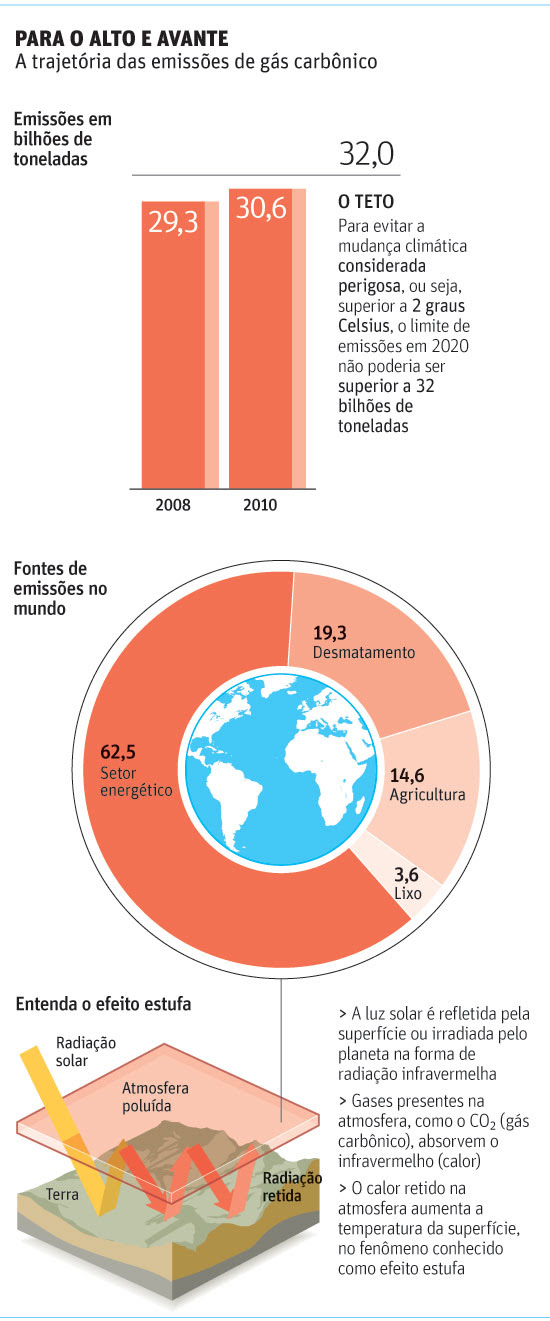 Para evitar esse risco, as emissões máximas até 2020 teriam de parar nos 32 bilhões de toneladas de CO2, ou seja, o aumento nos próximos dez anos teria de ser menor do que o entre 2009 e 2010, calcula a agência internacional.